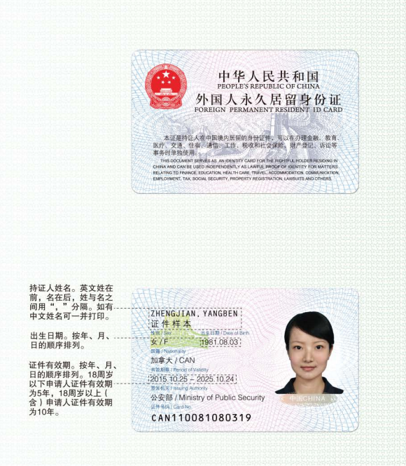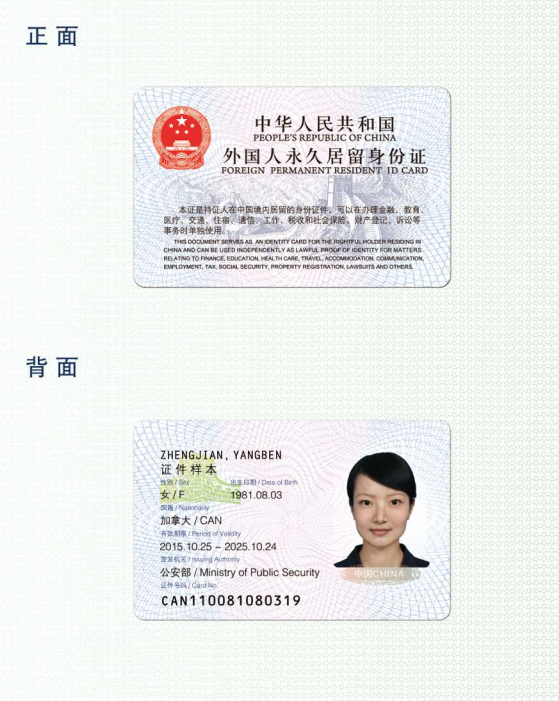 2017版外國人永久居留身份證采用彩色激光打印技術(shù)進(jìn)行個(gè)人化制作。正面有中英文證件名稱(chēng)以及證件使用提示辭。